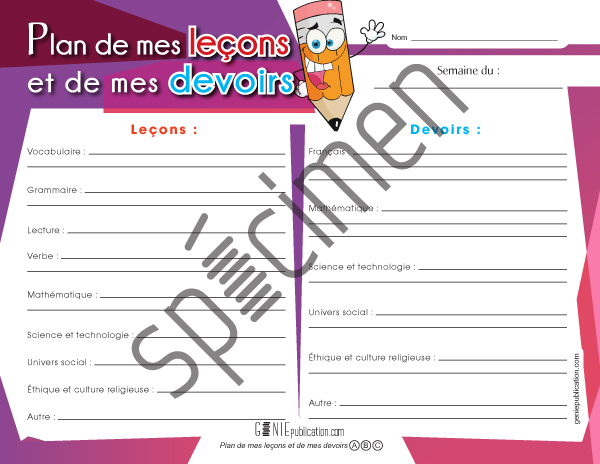 Page que l'élève peut utiliser pour écrire ses leçons et devoirs de la semaine.