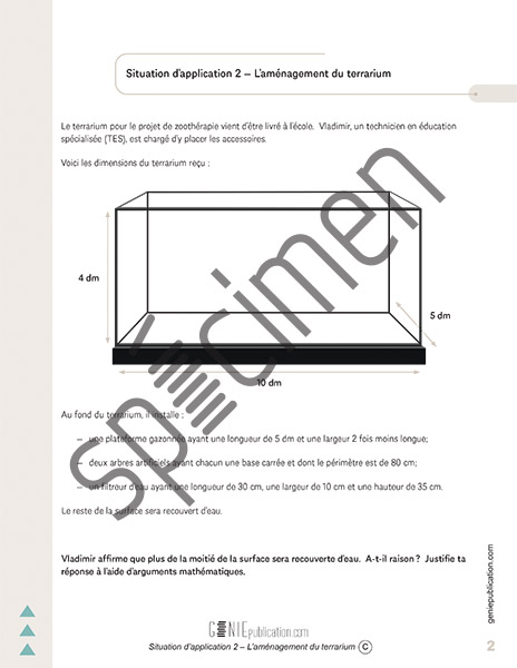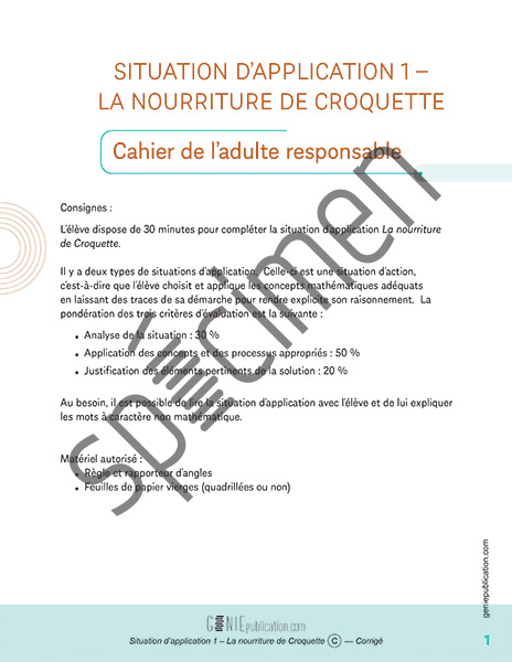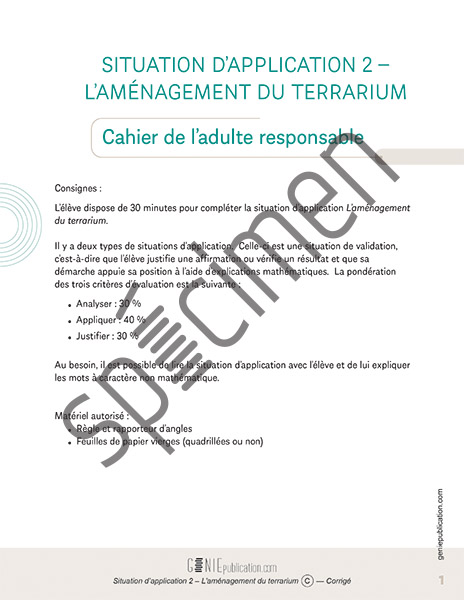 La nourriture de Croquette est une situation d’action, c’est-à-dire que l’élève choisit et applique les concepts mathématiques adéquats en laissant des traces de sa démarche pour rendre explicite son raisonnement. L’aménagement du terrarium et Le gardiennage de reptiles sont, quant à elles, des situations de validation, c’est-à-dire que l’élève justifie une affirmation ou vérifie un résultat et que sa démarche appuie sa position à l’aide d’explications mathématiques. L’élève dispose de 30 minutes pour compléter chacune d’elles.