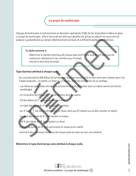 Le projet de zoothérapie est une situation-problème dans laquelle l’élève doit déterminer le nombre d’animaux de chaque type nécessaire au projet de zoothérapie de son école et calculer le cout total du projet. Il dispose de 2 heures pour la compléter.