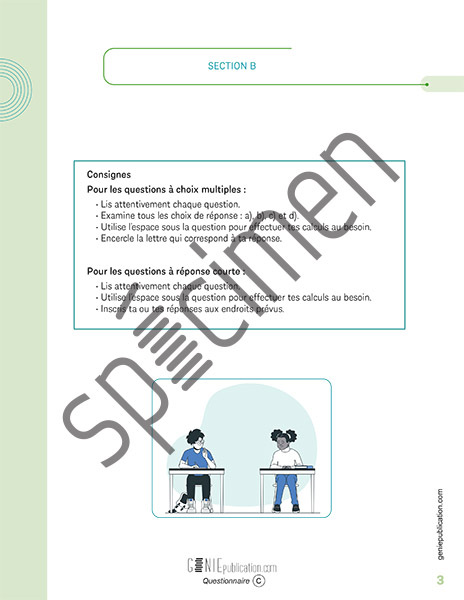 Le Questionnaire est séparé en deux sections. Dans la section A, l’adulte responsable lit à voix haute quatre questions de calcul mental à l’élève. Pour chaque énoncé, l’élève dispose de 10 secondes pour faire mentalement son calcul et inscrire sa réponse à l’endroit prévu à cet effet. La section B se déroule à l’écrit. Elle est constituée de 18 questions à choix multiple et à réponse courte, auxquelles l’élève doit répondre seul et dans un délai de 60 minutes.