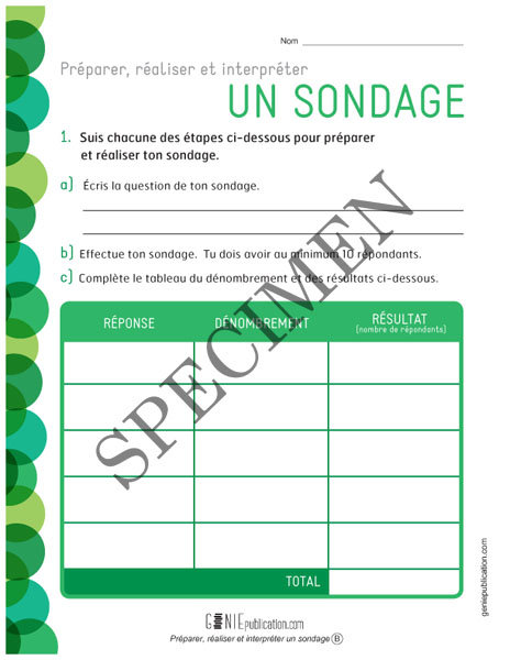 L'élève doit d'abord préparer et réaliser un sondage à une seule question sur le sujet de son choix. Il doit par la suite inscrire les résultats de ce sondage dans un diagramme à bandes et les interpréter.