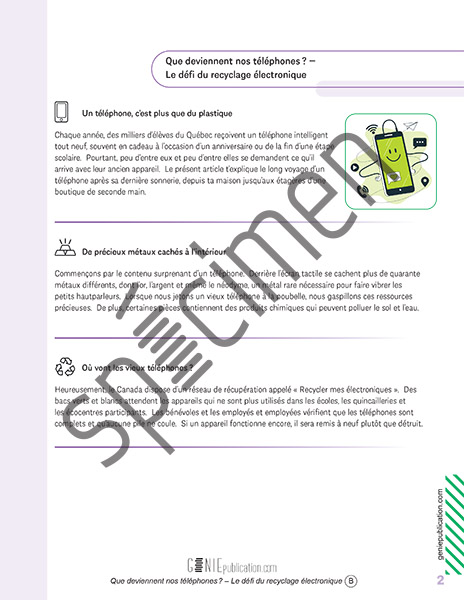 Que deviennent nos téléphones ? – Le défi du recyclage électronique est un texte de 1 128 mots suivi de 12 questions (questions d’ordonnancement, à réponse courte et à réponse élaborée). Cette activité a été conçue selon le modèle des épreuves et présente un cahier de l’élève (comprenant le texte Que deviennent nos téléphones ? – Le défi du recyclage électronique et un cahier de réponses) ainsi qu’un cahier de l’adulte responsable (comprenant le corrigé).