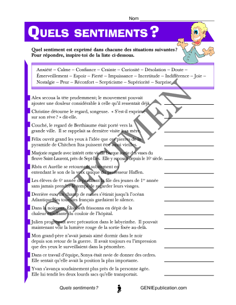 Dans cette activité, l'élève nomme le sentiment que la phrase laisse sous-entendre. Une liste de sentiments est proposée.