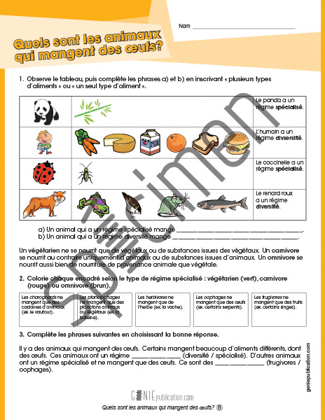 L'élève se familiarise avec les concepts de régime spécialisé, régime diversifié, végétarien, carnivore<>em> et omnivore ainsi qu'avec des termes plus spécifiques comme oophage, planctophage, frutivore et herbivore.