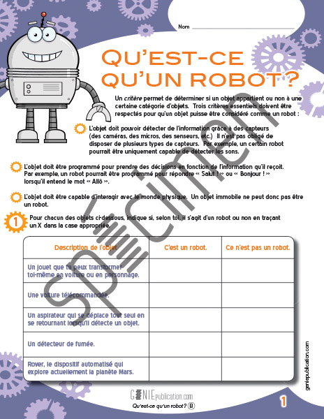 L'élève doit comprendre ce qu'est un critère et distinguer différents objets en indiquant s'il s'agit de robots ou non. Il doit ensuite inventer son propre robot en respectant les critères