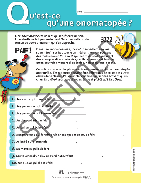 L'élève doit compléter des phrases en écrivant des onomatopées et des signes de ponctuation appropriés.