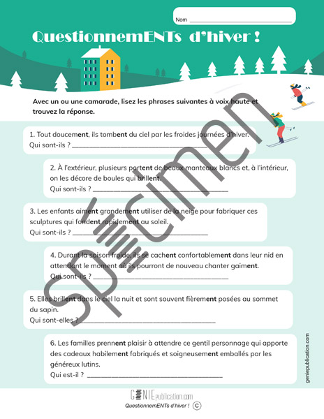 Avec un ou une camarade, l’élève lit à voix haute 6 devinettes comportant des verbes conjugués à la troisième personne du pluriel et au présent ainsi que des adverbes se terminant par -ment. Tout en pratiquant les terminaisons en -ent, l’élève peut s’amuser à chercher le mot sur le thème de l’hiver dont il est question dans la devinette.