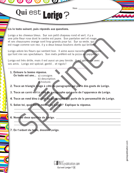 L'élève doit lire la description d'un personnage et répondre à des questions de compréhension.