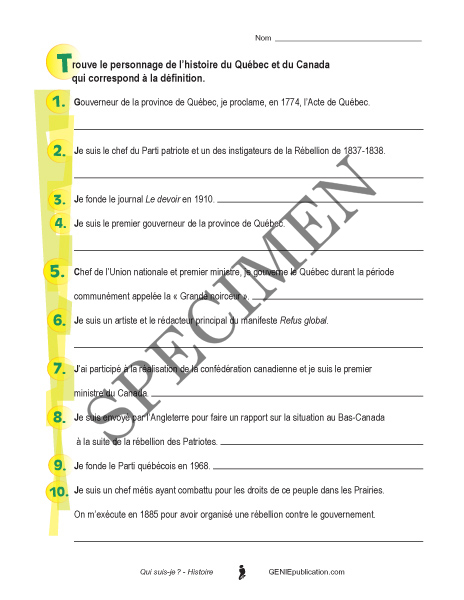 L'élève du 3e cycle doit identifier des personnalités historiques à partir de leur rôle ou d'évènements auxquels ils ont pris part. Cette activité vérifie les connaissances acquises dans le cadre du programme Histoire et éducation à la citoyenneté.