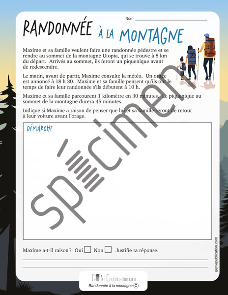 Dans cette activité, l’élève doit déterminer si Maxime et sa famille pourront compléter leur randonnée pédestre et leur piquenique à la montagne Utopia avant l’orage annoncé.
