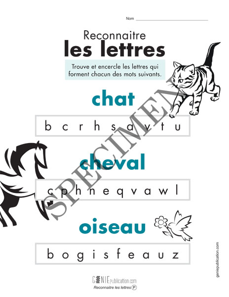 L’élève doit repérer et identifier les lettres qui composent différents mots.
