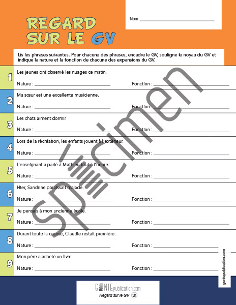 L'élève doit repérer le GV dans les phrases, identifier le noyau du GV et nommer la nature et la fonction de l'expansion de chacun des GV.