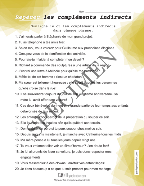 L’élève doit souligner les compléments indirects présents dans les vingt phrases proposées.