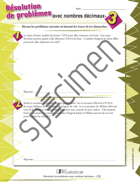 L'élève doit additionner des nombres décimaux pour résoudre deux courts problèmes écrits.