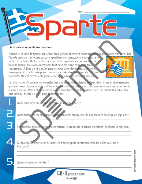 L'élève doit lire un court texte au sujet de la ville de Sparte et répondre à des questions de compréhension.