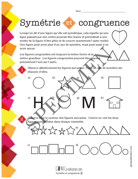 L'élève doit d'abord dessiner un axe de symétrie sur différentes figures, puis identifier les figures congruentes dans des ensembles.