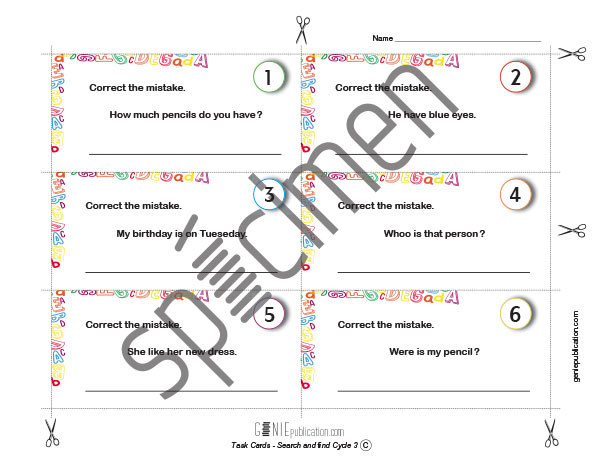 Ensemble de 30 cartes à tâches. Chaque carte présente une phrase contenant une erreur d'orthographe ou de grammaire. Les élèves peuvent répondre individuellement, en petite équipe ou en grand groupe. Le corrigé se trouve sur la dernière page.