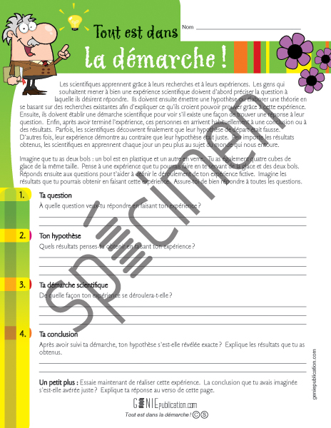 L'élève doit imaginer une expérience avec des éléments matériels imposés, puis répondre à des questions afin de structurer sa démarche.