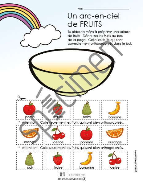 L'élève doit placer les mots correctement orthographiés dans le bol de salade de fruits.