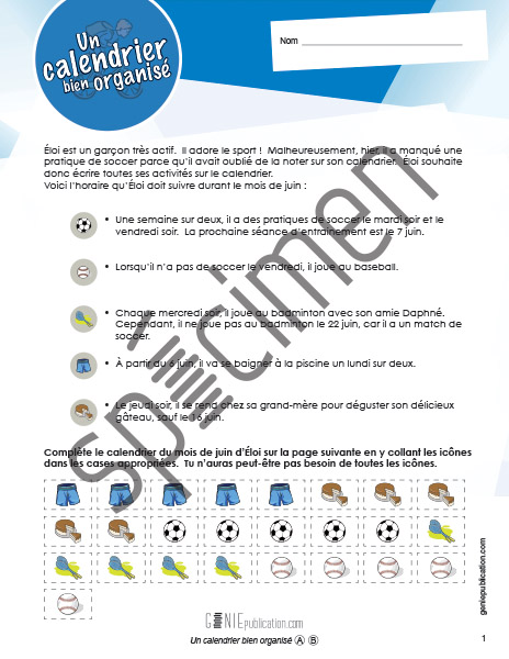 Après avoir lu un texte, l'élève doit placer des activités sur un calendrier.