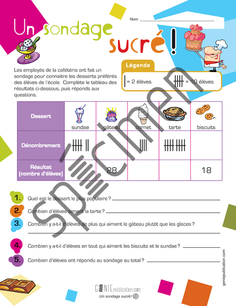 L'élève doit compléter le tableau des résultats d'un sondage fictif et répondre à des questions en lien avec les données.
