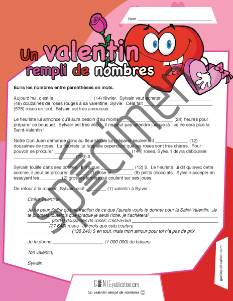 L'élève doit écrire en mots chacun des nombres entre parenthèses d'un texte sur le thème de la Saint-Valentin.