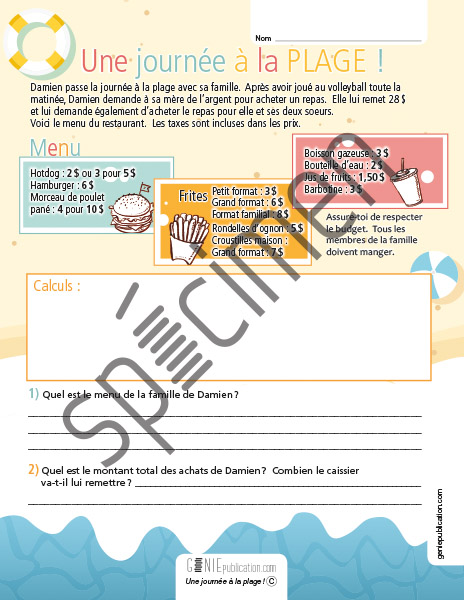 L'élève doit calculer le montant des achats de Damien qui passe la journée à la plage.