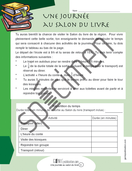 L'élève doit utiliser ses connaissances sur les fractions pour calculer les minutes allouées à chaque activité de la journée.