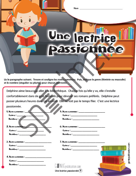 L'élève doit repérer les noms communs dans un texte. Puis, il doit indiquer le genre et le nombre de ces noms communs.