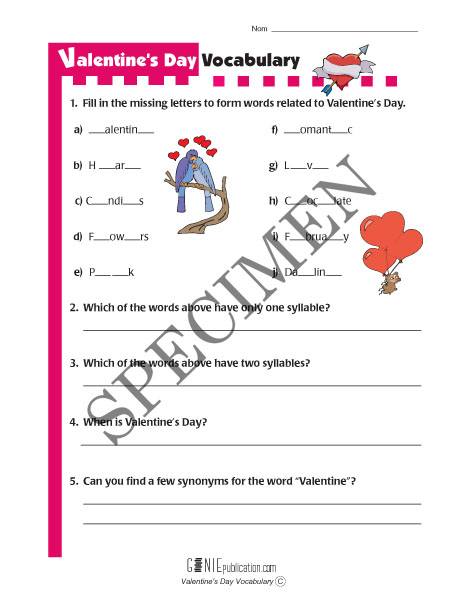 L'élève doit compléter des mots de vocabulaire et répondre à des questions en lien avec le thème de la Saint-Valentin.