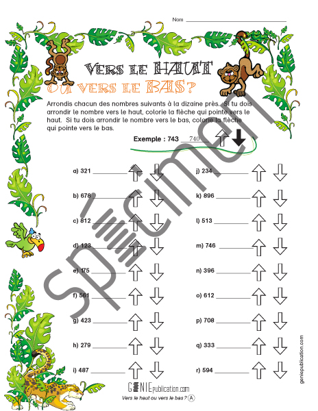 L'élève doit arrondir des nombres à la dizaine près et indiquer s'il a dû arrondir vers le haut ou vers le bas en coloriant la flèche correspondante.