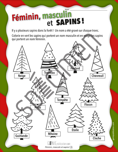 C’est bientôt le temps des Fêtes ! Sur les sapins de la forêt, un nom a été gravé sur chaque tronc. Si le nom est masculin, l’élève doit colorier le sapin en vert et, s’il est féminin, il doit le colorier en rouge. Une activité plaisante qui permet de travailler le genre des noms !