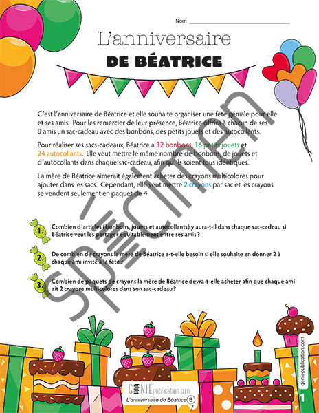 Dans cette situation d’application, l’élève doit aider Béatrice à préparer les sacs-cadeaux pour les personnes invitées à sa fête.