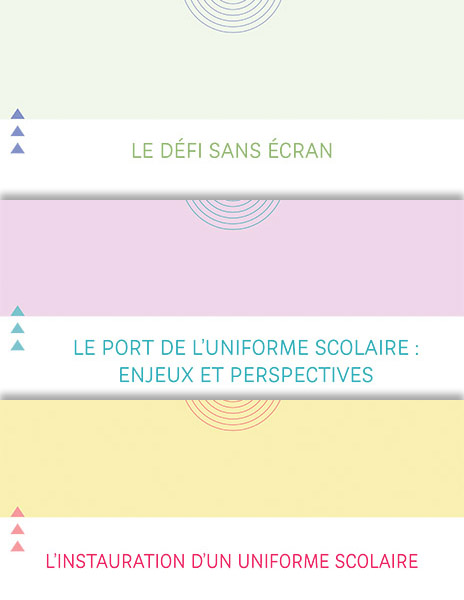Note : Ce document est aussi offert dans l'abonnement, séparé en trois documents distincts : Le défi sans écran, Le port de l’uniforme scolaire : enjeux et perspectives, L’instauration d’un uniforme scolaire