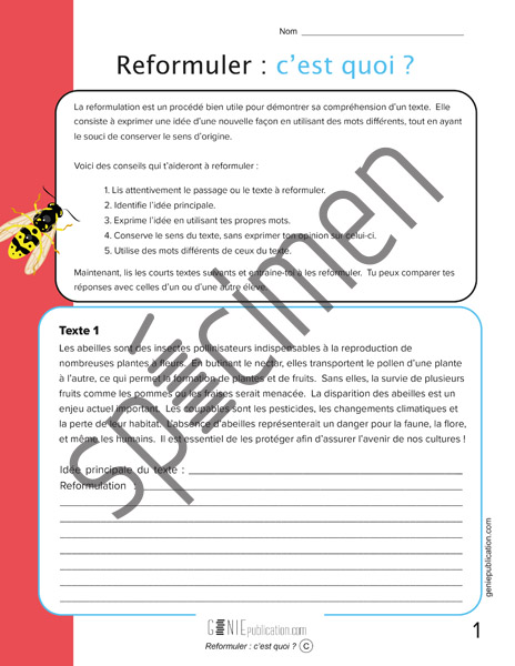 Dans cette activité, l’élève se familiarisera avec le procédé de la reformulation. Il lira d’abord 5 conseils pour bien reformuler un texte. Ensuite, ce sera à son tour de jouer ! Il devra lire 4 textes, identifier l’idée principale de ceux-ci et les reformuler dans ses mots.