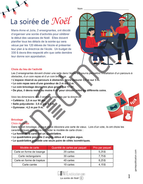 Deux enseignantes ont décidé d’organiser une soirée d’activités pour célébrer les vacances de Noël. Les deux enseignantes doivent planifier tous les détails de la soirée qui sera vécue par les 120 élèves de l’école et ensuite, elles doivent présenter leur plan final de la soirée à la directrice de l’école. Cette dernière devra approuver le tout et le budget de 330$ devra être respecté.